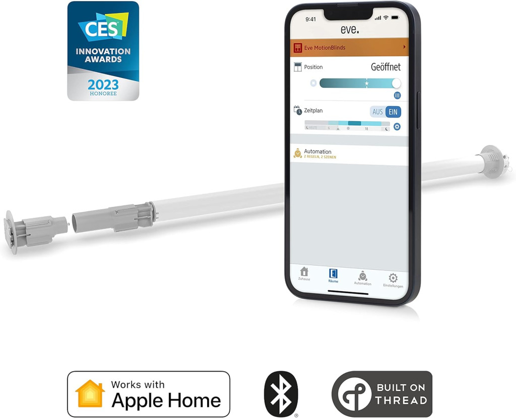 Az Eve MotionBlinds, egy díjnyertes modernizációs készlet, amely lehetővé teszi, hogy az ablakredőnyeid egy gombnyomásra működjenek. Az Eve MotionBlinds telepítése után továbbra is kezelheted manuálisan a redőnyöket, de választhatsz a kényelmesebb megoldást is, és vezérelheted őket alkalmazások, hangutasítások által vagy automatikus tervek segítségével, amelyek az életstílusodhoz igazodnak. Ha az Eve MotionBlindes redőnyvezérlő készletet okos otthonodba integrálva, távolról irányíthatod a redőnyöket.