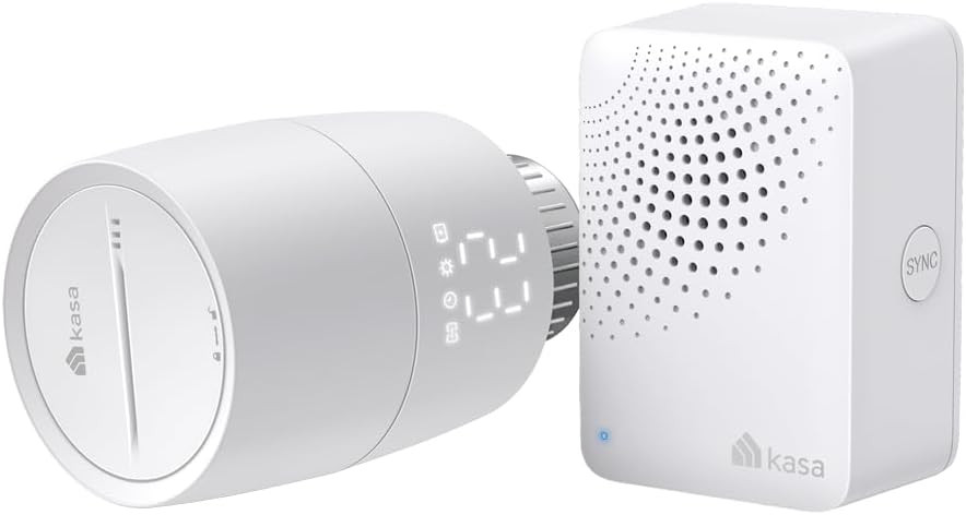 Fűtésszabályozó készlet - Kasa Smart radiátor termosztátfej + KH100 kommunikációs átjáró, kommunikáció: 868 MHz, 2× AA elem, beállítás: 5-30℃, M30*1,5 mm, LED kijelző, Kasa smart app, Alexa & Google Home hangvezérlés, RA/RAV/RAVL redukció a csomagban