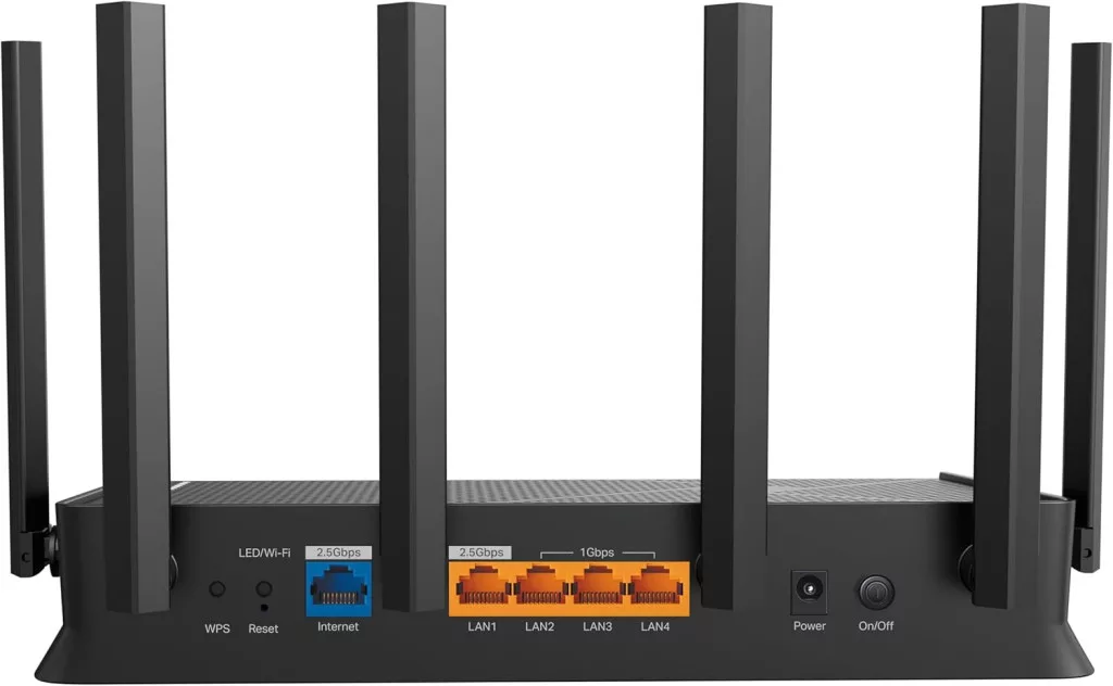 2,5 G-s vezetékes kapcsolat: 1×2,5 Gbps-es WAN-port, 1×2,5 Gbps-es LAN-port és 3×1 Gbps-es LAN-portok biztosítják a nagy sebességű adatátvitelt.