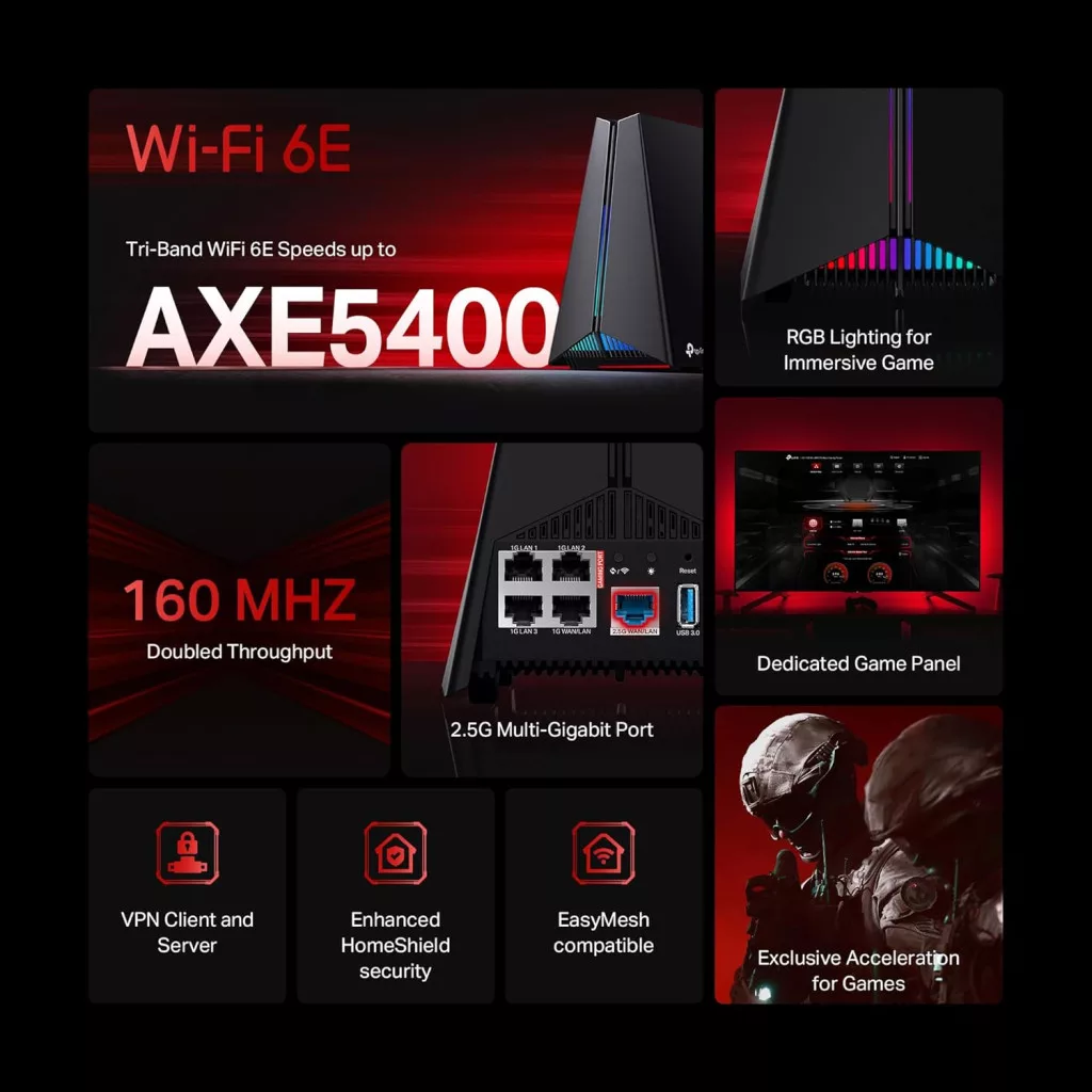 Wi-Fi 6E AXE5400 Tri-band Wi-Fi: Az akár 5,4 Gbps sebességű tri-band Wi-Fi-vel eszközei mindig készen állnak a legkeményebb csatákra. A teljesen új 6 GHz-es sáv kivételes sávszélességet és interferenciamentes csatornákat kínál, amelyek kizárólag a Wi-Fi 6E eszközök számára állnak rendelkezésre.