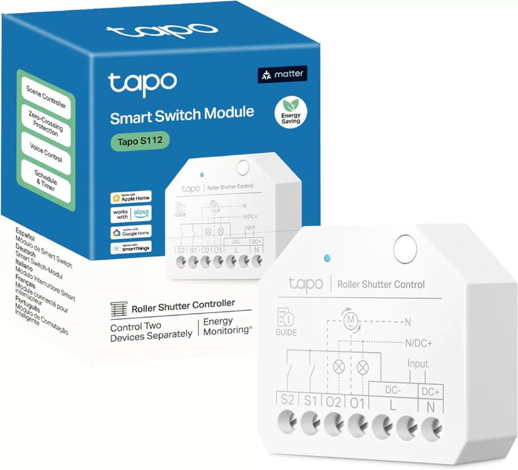 A Tapo S112 egy kompakt, 2 csatornás intelligens relé kapcsoló WLAN (2,4 GHz) és Bluetooth vezérléssel – ideális kétirányú motorok (pl. redőnyök) integrálásához vagy két világítási áramkör vagy aljzat külön vezérléséhez.