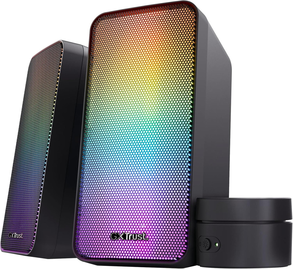 Trust Gaming GXT 611 Wezz 2,0 PC Lautsprecher mit RGB LED-Beleuchtung, 12 W (6 W RMS), 3,5 mm AUX Klinke, USB Soundsystem, Stereo Computer Boxen für PC, Laptop, Tablet, Desktop - Schwarz